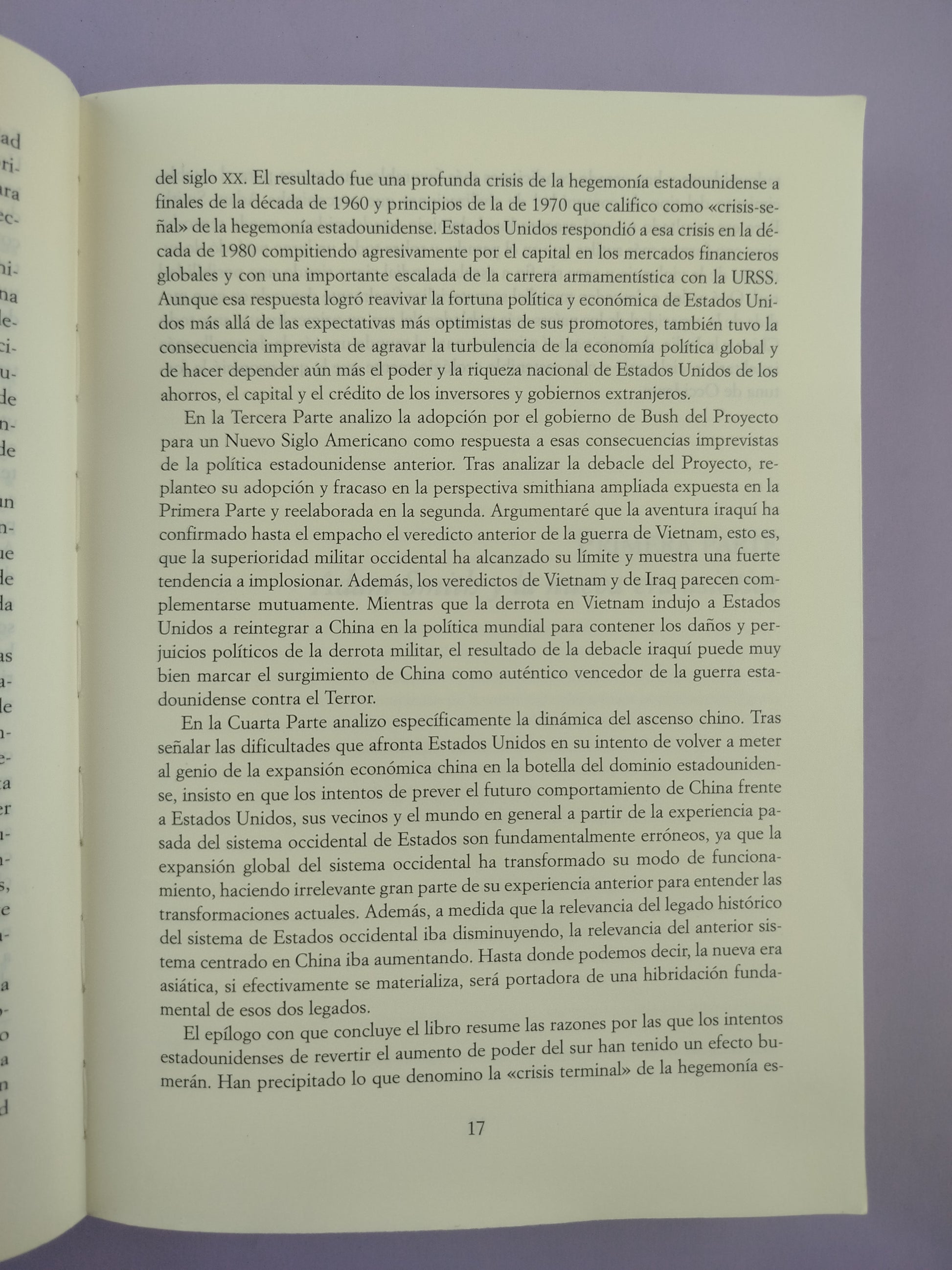 Este libro analiza magistralmente cuál ha sido la senda de evolución socio-económica de China durante los últimos siglos al hilo de los cuales el capitalismo surgió en el extremo occidental de Eurasia llegando a subyugar a todo el planeta a finales del siglo XIX, y cómo esa senda ha divergido profundamente del modelo europeo caracterizado por una revolución militar y tecnológica permanente que ha sustentado sus modalidades de construcción del Estado, acumulación de capital y conquista territorial. Estudia también el modelo de crecimiento chino basado en un uso intensivo del mercado que no mutó para convertirse en el crisol de un desarrollo capitalista y en un recurso mucho más moderado a la guerra en comparación con las pautas bélicas occidentales.