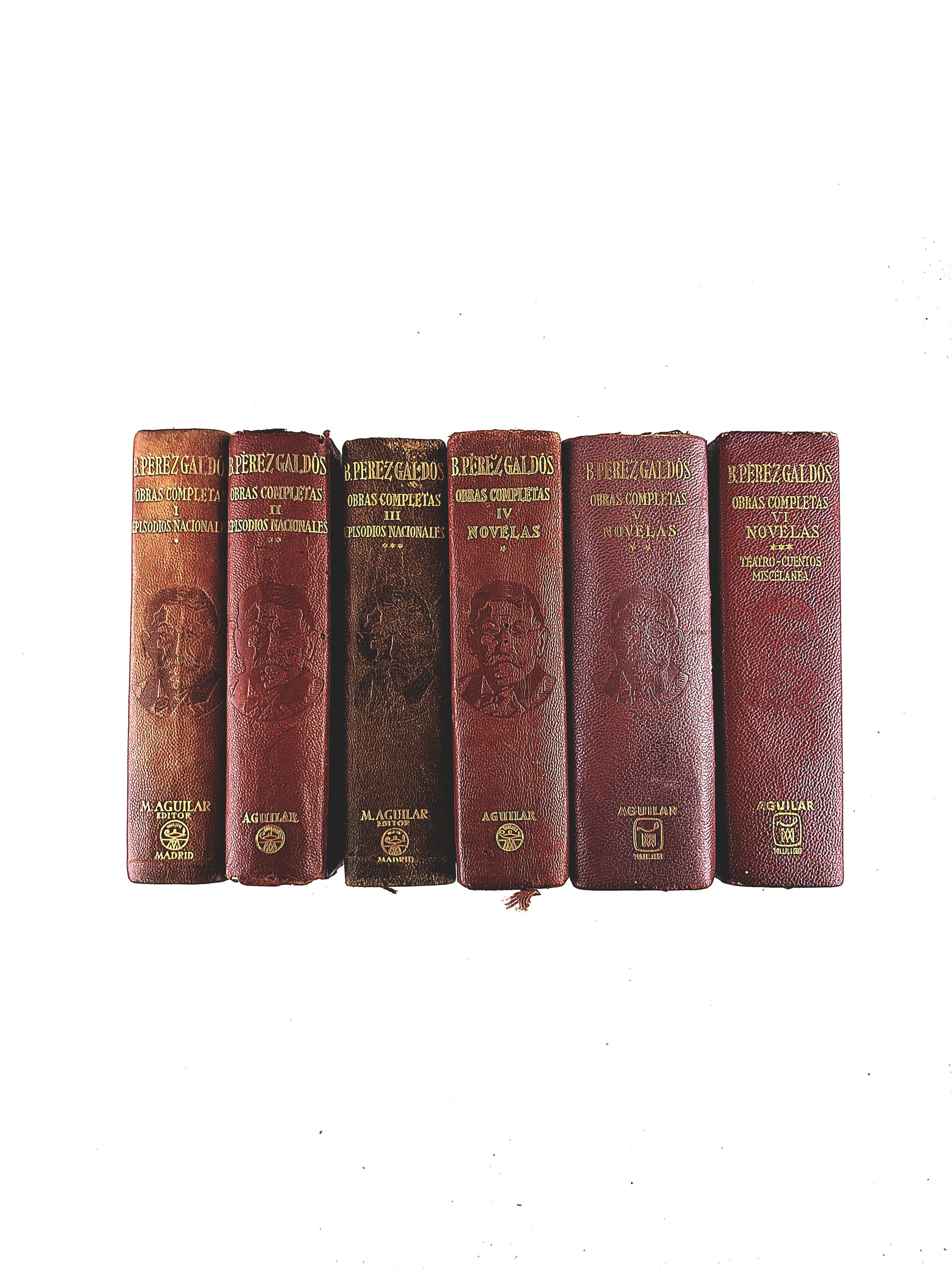 ra edición. Introducción, biografia, bibliografia, notas y censo de personajes galdosians, por Federico arlos Sáinz de Robles. Fotografias en blanco y negro sobre Galdós y su vida. Los volumenes I-II-III son los Episodios Nacionales, y los volumenes IV-V-VI son las Novelas, el Teatro, los Cuentos y Miselanea. Libro de ocasión editado en 1ª edición en Madrid entre los años 1941 y 1942 con 1603,1722,1831, 1903, 2043 y 2043 páginas. Encuadernado en piel con dorados en portada y lomo. cortes decorados con imágenes representativas de personajes de las novelas y de los episodios nacionales. Papel biblia y cinta de registro. Texrto a dos columnas.