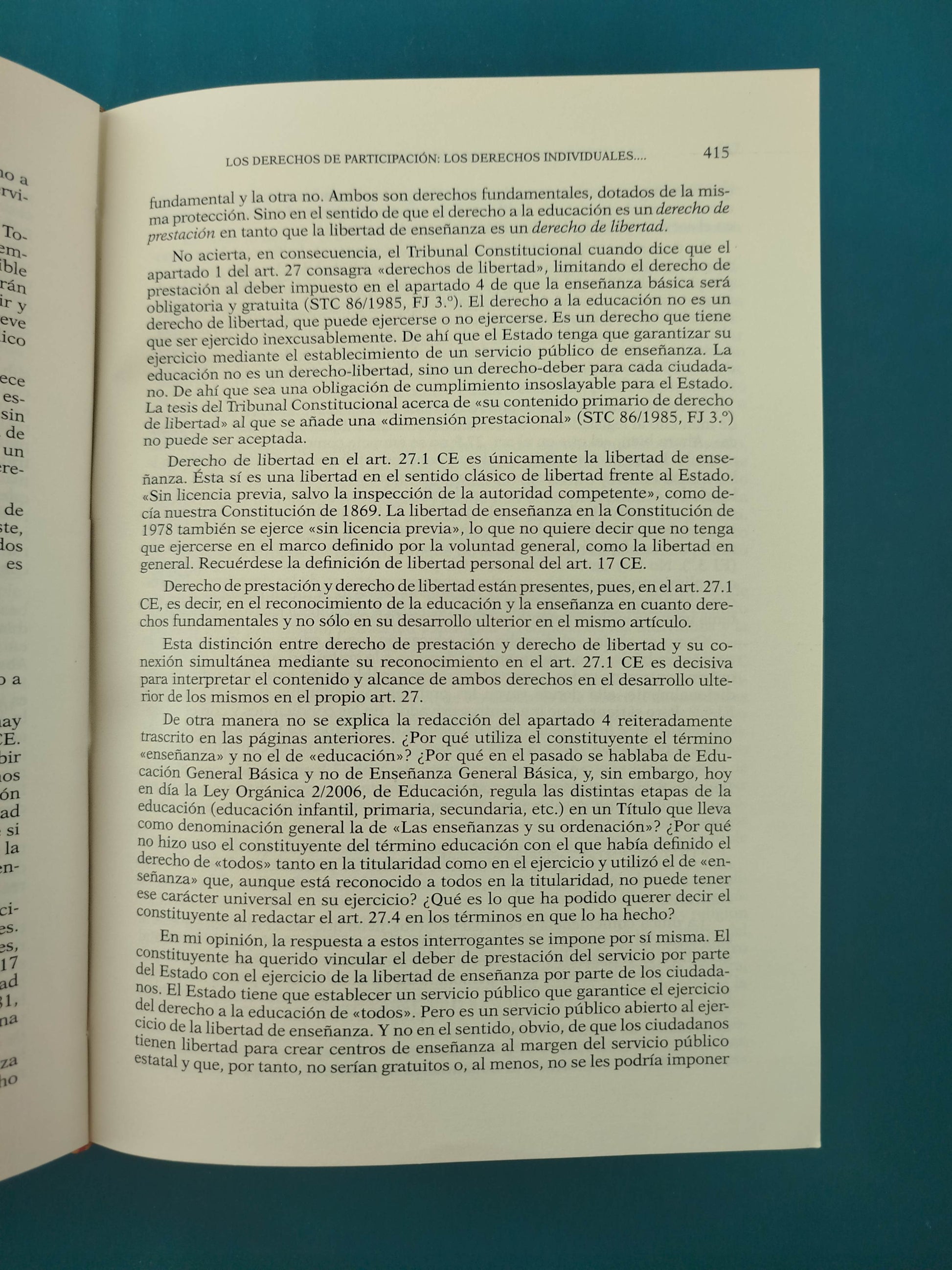El derecho constitucional. / El Estado./ La Constitución./ El poder constituyente. La interpretación de la Constitución. / Las garantías constitucionales. / El control de constitucionalidad. / La reforma de la Constitución./ Estado y Constitución. / Sociedad y Constitución. / La definición de los derechos como derechos fundamentales. / La igualdad constitucional o el derecho a la diferencia. / Los derechos constitutivos de la personalidad. / Los derechos de la comunicación física; intelectual y social. / Los derechos de participación./ Los derechos y deberes de los ciudadanos./ Garantía constitucional de los derechos. / El cuerpo electoral. / La democracia.