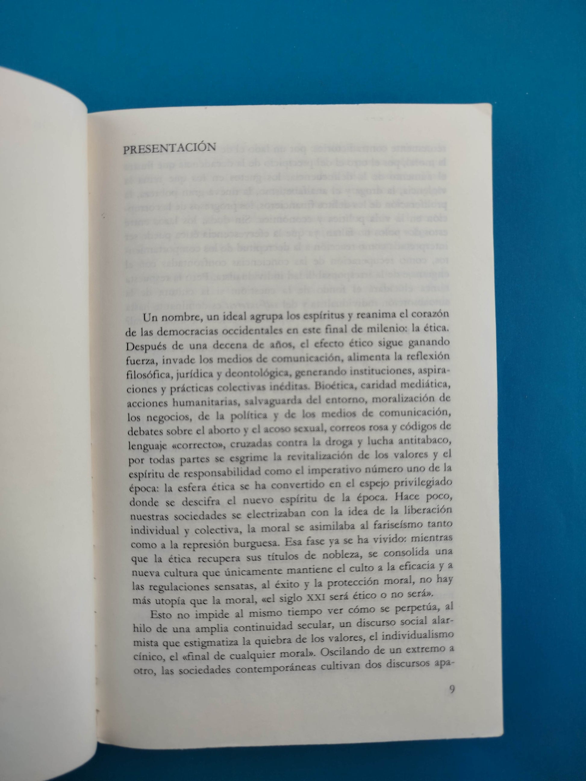 Bioética, caridad mediática, acciones humanitarias, salvaguarda del medio ambiente, moralización de los negocios, de la política y de los media, debates sobre el aborto y el acoso sexual, cruzadas contra la droga y el tabaco: la revitalización de los «valores» y el espíritu de responsabilidad se esgrimen por doquier como el imperativo prioritario de la época. Hasta hace poco, nuestras sociedades vibraban con la idea de liberación individual, hoy proclaman que la única utopía posible es la moral. Las democracias repudian la retórica del deber austero y consagran los derechos individuales a la autonomía, al deseo, a la felicidad. Frente a las amenazas del neomoralismo, así como del cinismo de corto alcance, conviene rehabilitar la inteligencia como ética que se muestra menos preocupada por las intenciones puras que por los resultados benéficos para el hombre, que no exige el heroísmo del desinterés, sino el espíritu de responsabilidad y la búsqueda de compromisos razonables.