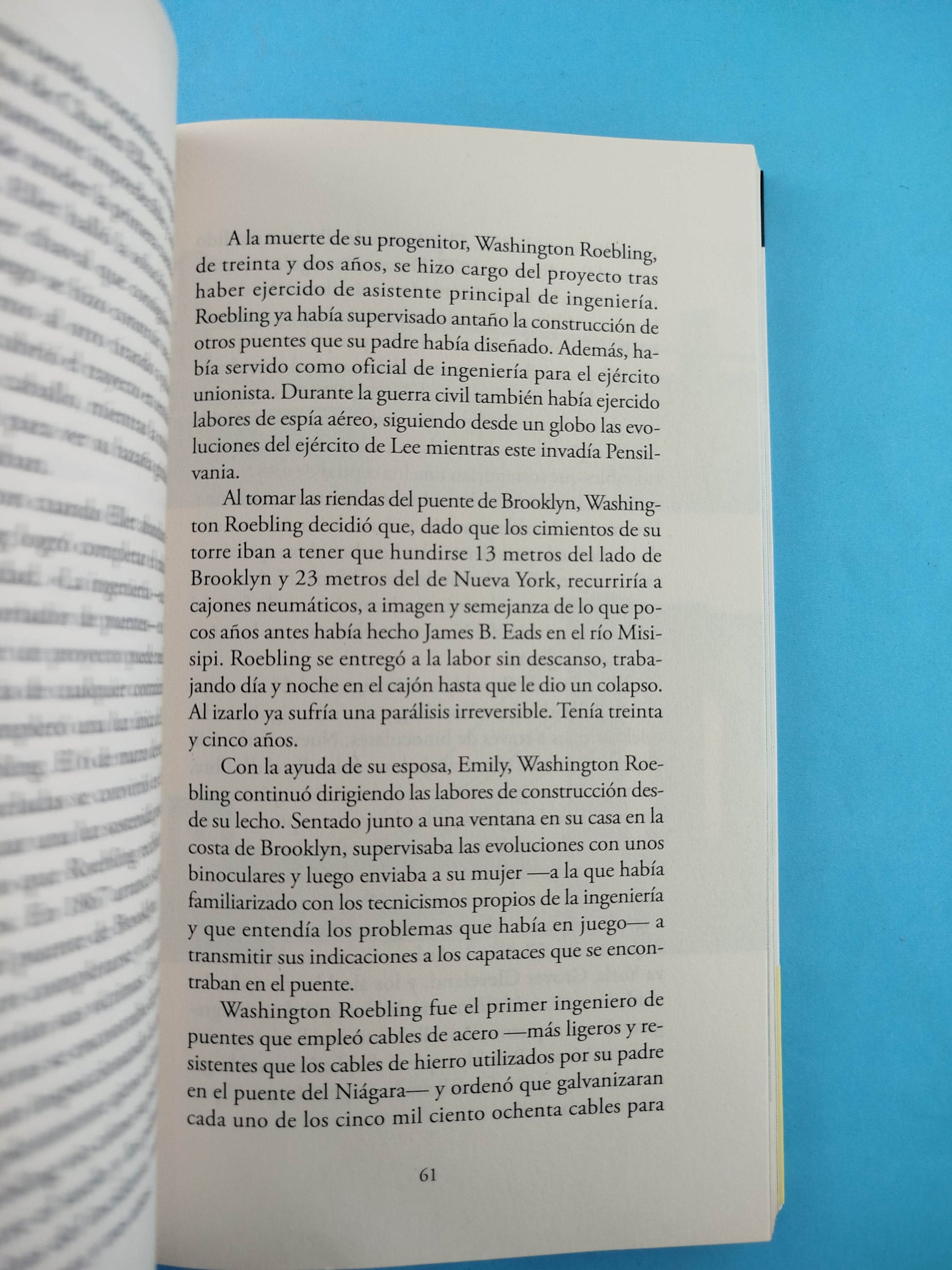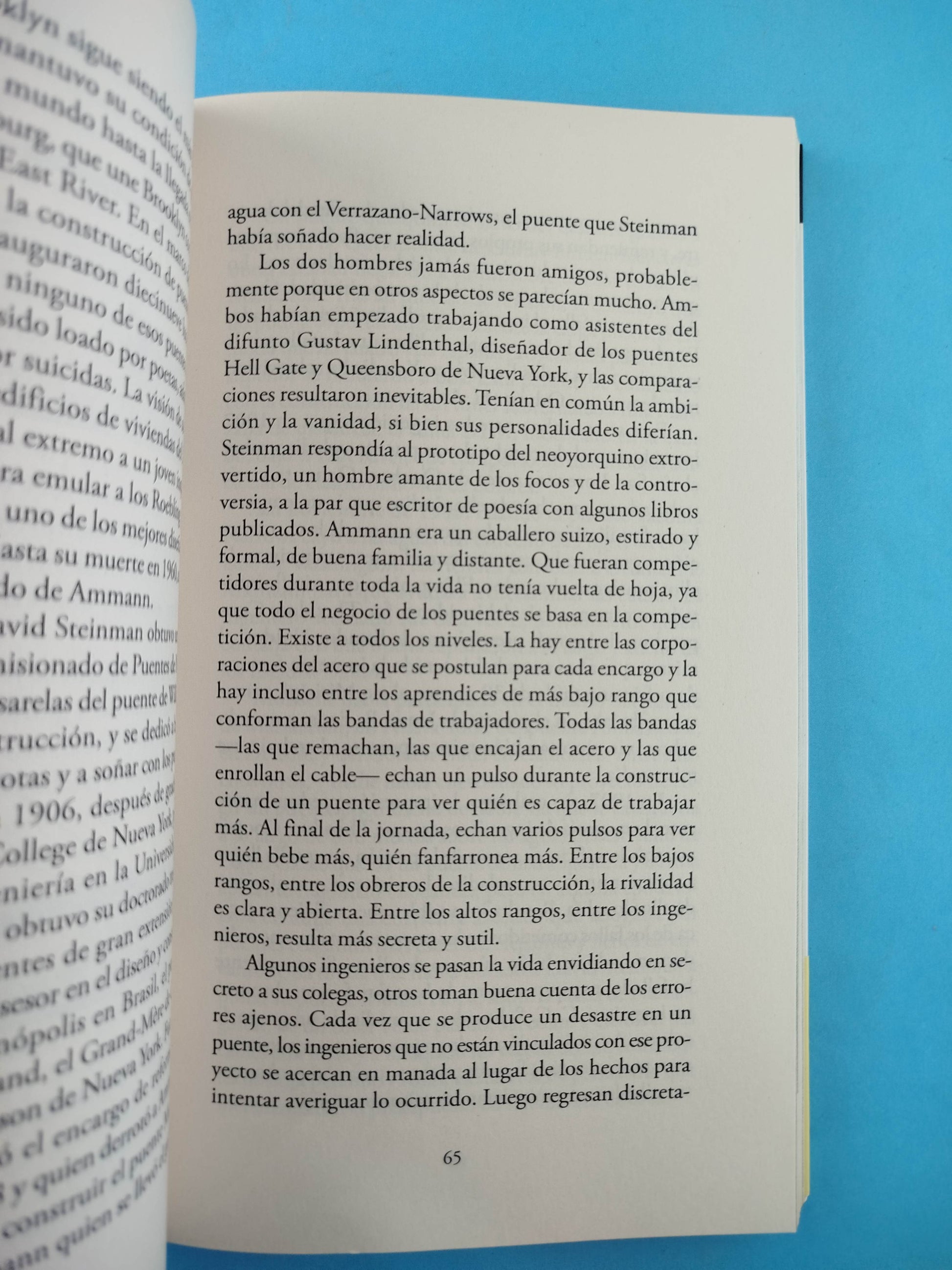 El puente Por Gay Talese ,«Llegan a la ciudad en coches enormes, viven en habitaciones amuebladas, beben whisky acompañado de chupitos de cerveza y persiguen a mujeres que no tardarán en olvidar. Se quedan poco tiempo, no más del que necesitan para construir el puente.» A finales de 1964 se completaron las obras del puente de Verrazano-Narrows, que une Brooklyn y Staten Island y que, medio siglo después, sigue considerándose un prodigio de la ingeniería: con sus 4.176 metros de longitud, es el puente colgante más largo de Estados Unidos y el sexto del mundo. Gay Talese, que siguió de cerca el levantamiento de este monumento al esfuerzo del hombre, recogió en El puente las historias humanas que se hallaban tras su construcción, desde el día a día de los obreros que trabajaban sobre vigas a alturas de vértigo hasta los acuerdos a puerta cerrada que desplazarían vecindarios enteros, en la vida de una pareja de amantes, de un dentista o de una familia con diecisiete hijos (más dos perros y un gato).
