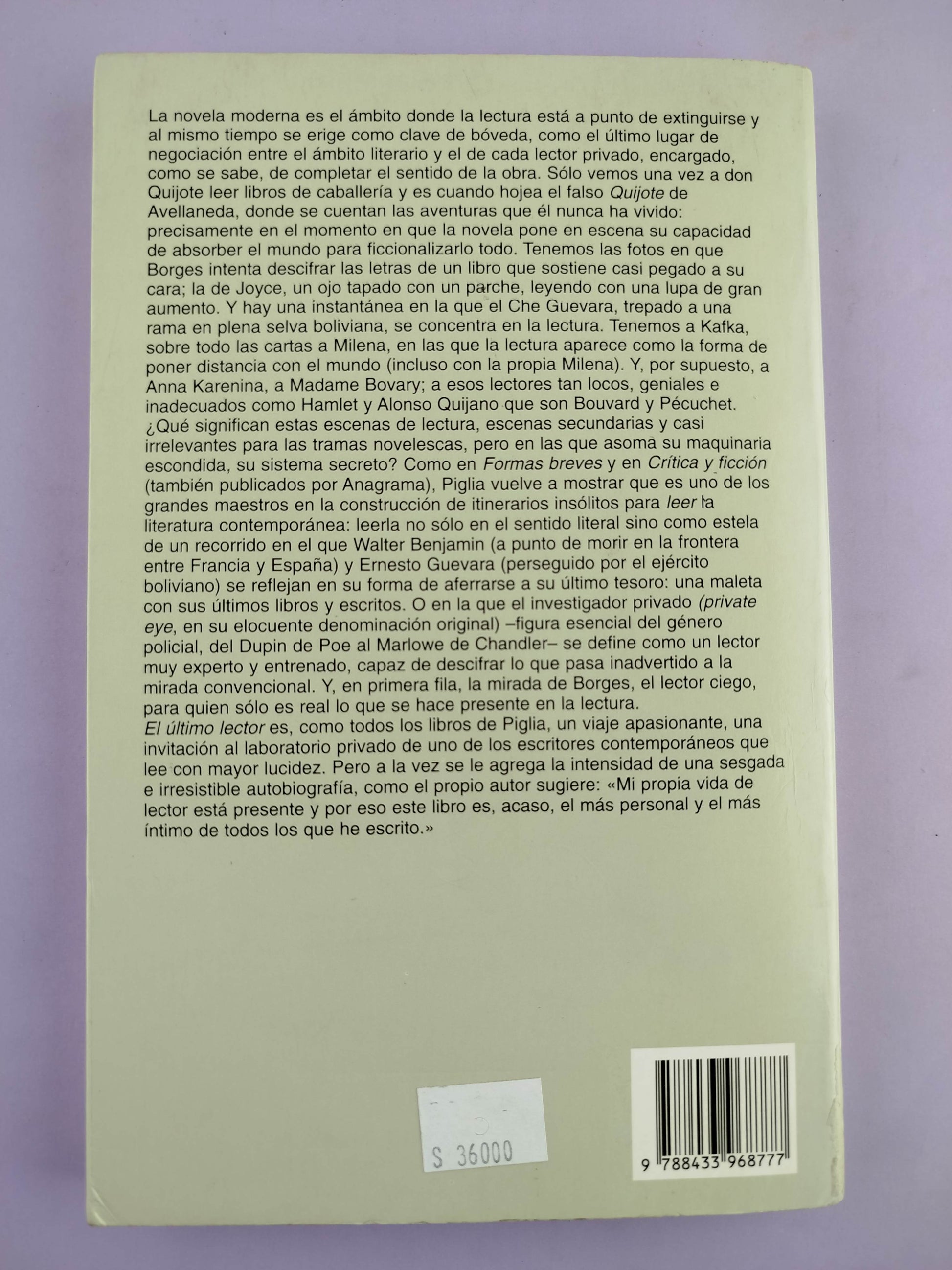 La novela moderna es el ámbito donde la lectura está a punto de extinguirse y al mismo tiempo se erige como clave de bóveda, como el último lugar de negociación entre el ámbito literario y el de cada lector privado, encargado, como se sabe, de completar el sentido de la obra. Sólo vemos una vez a don Quijote leer libros de caballería y es cuando hojea el falso Quijote de Avellaneda, donde se cuentan las aventuras que él nunca ha vivido: precisamente en el momento en que la novela pone en escena su capacidad de absorber el mundo para ficcionalizarlo todo. Tenemos las fotos en que Borges intenta descifrar las letras de un libro que sostiene casi pegado a su cara; la de Joyce, un ojo tapado con un parche, leyendo con una lupa de gran aumento. Y hay una instantánea en la que el Che Guevara, trepado a una rama en plena selva boliviana, se concentra en la lectura. Tenemos a Kafka, sobre todo las cartas a Milena, en las que la lectura aparece como la forma de poner distancia con el mundo (incluso con la propia Milena). Y, por supuesto, a Anna Karenina, a Madame Bovary; a esos lectores tan locos, geniales e inadecuados como Hamlet y Alonso Quijano que son Bouvard y Pécuchet.