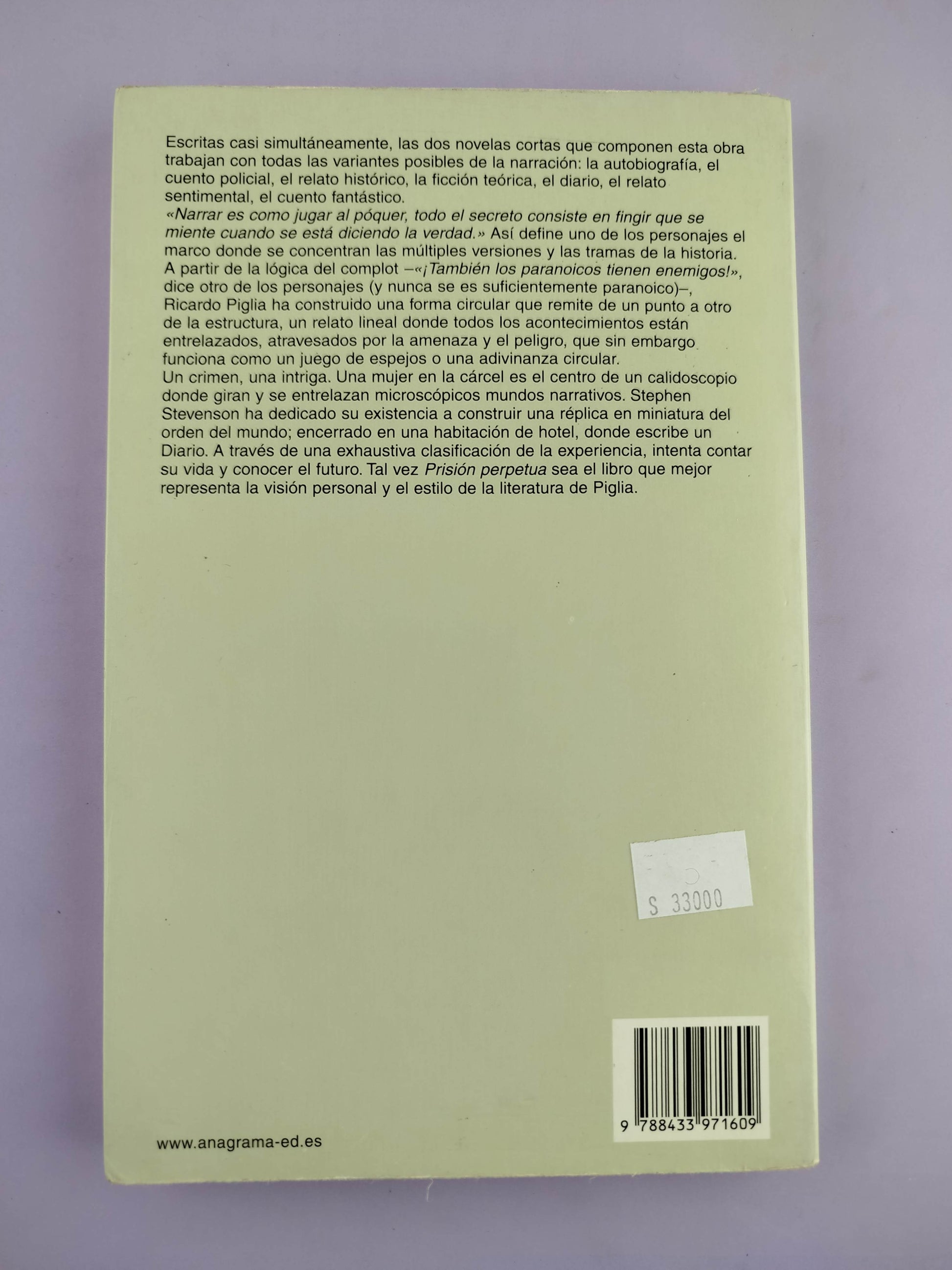 Escritas casi simultáneamente, las dos novelas cortas que componen esta obra trabajan con todas las variantes posibles de la narración: la autobiografía, el cuento policial, el relato histórico, la ficción teórica, el diario, el relato sentimental, el cuento fantástico. A partir de la lógica del complot, Piglia ha construido un relato lineal donde todos los acontecimientos están entrelazados, atravesados por la amenaza, que sin embargo funciona como un juego de espejos o una adivinanza circular. Un crimen, una intriga. Una mujer en la cárcel es el centro de un calidoscopio donde giran microscópicos mundos narrativos. Encerrado en una habitación de hotel, donde escribe un Diario, Stephen Stevensen ha dedicado su existencia a construir una réplica en miniatura del orden del mundo. A través de una exhaustiva clasificación de la experiencia, intenta contar su vida y conocer el futuro. Quizá sea el libro, ahora en su versión definitiva, que mejor representa el estilo de la literatura de Piglia.