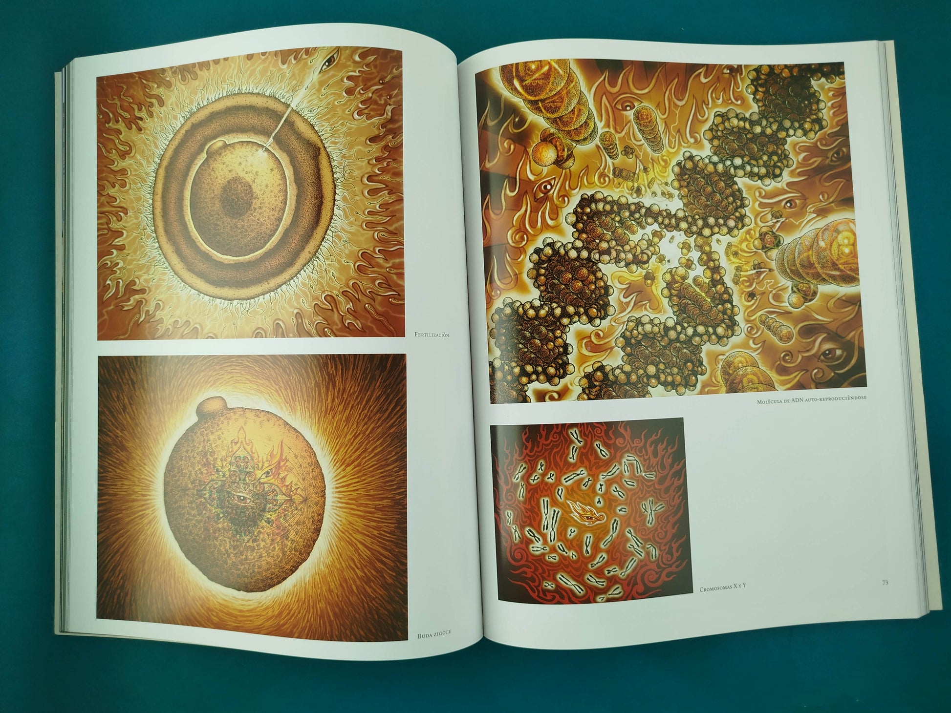 El arte de Alex Grey nos conduce a un viaje transformativo, a través de la intransparencia y oscuridad del mundo material, hacia la recuperación de nuestro corazón, divinamente iluminado. Las imágenes de transformarse, de dolor existencial, búsqueda y confusión, amor, muerte y trascendencia, son iconos en las extensas galerías de la odisea creativa de Grey. Desde sus tempranos autorretratos y sus pinturas de esqueletos, hasta sus más recientes seres universales, enrejados con fuego y ojos, Grey nos trae una contemplación visual que siempre se está profundizando sobre la naturaleza de la identidad personal y transpersonal.